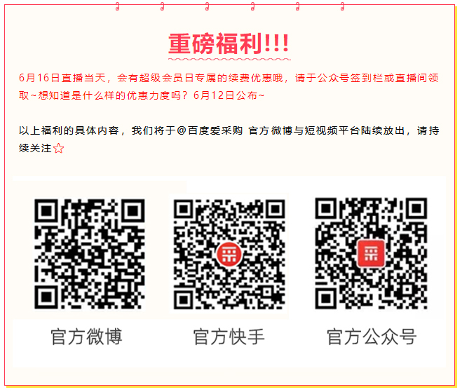 該活動已在@百度愛采購 微博發(fā)出,如果您是2019年6月16日入駐百度愛采購的客戶,請您通過微博、微信、短視頻等平臺,用視頻或文字的形式說出您對于愛采購的使用感受和祝福,并@百度愛采購,您將收獲一份#616愛采購超級會員日#的限定驚喜!